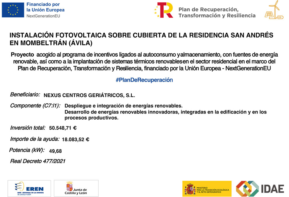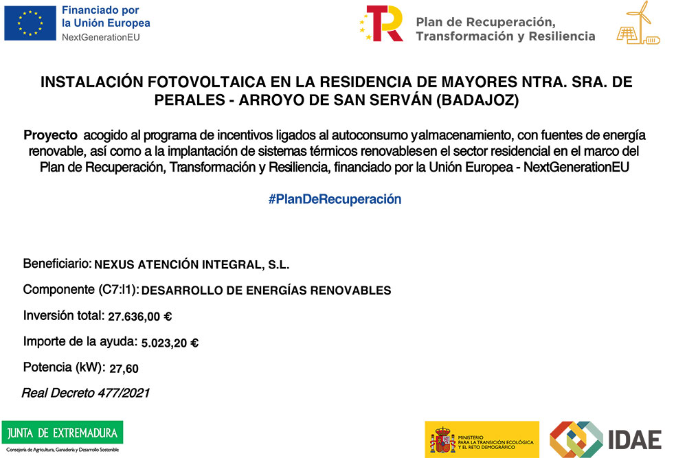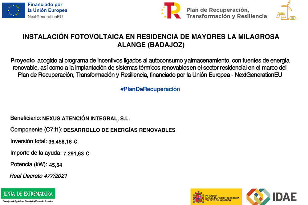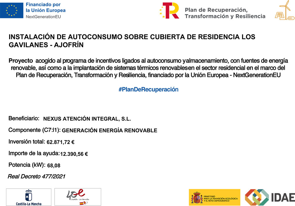 Informamos de que hemos sido beneficiarios de subvenciones para la implantación de instalaciones de autoconsumo (fotovoltaica) en cubiertas, en el marco del Plan de Recuperación, Transformación y Resiliencia (NextGenerationEU) y conforme al Real Decreto 477/2021. Estas ayudas respaldan distintos proyectos ejecutados en varios de nuestros centros, entre ellos Navarredonda – El Campillo de la Jara, Los Gavilanes – Ajofrín, Tamujoso – Belvís de la Jara, La Milagrosa – Alange, Ntra. Sra. de Perales – Arroyo de San Serván y San Andrés – Mombeltrán. A continuación, se adjunta el cartel informativo oficial de cada actuación.